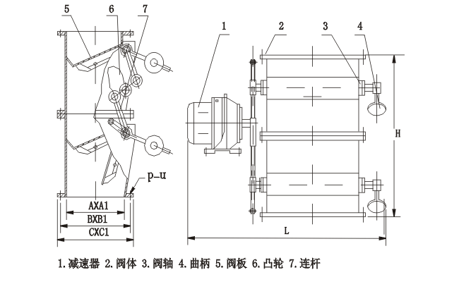 由減速器帶動傳動桿通過曲柄、凸輪及連桿分別帶動上、下兩傳動軸旋轉(zhuǎn),交互開啟,通過配備的杠桿系統(tǒng)或拉伸彈簧,保證閥板可靠的復(fù)位,防止野風吹入,依確定的開閉頻率完成系統(tǒng)的給卸料。